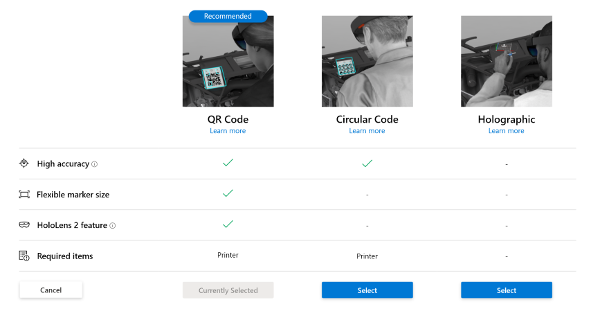 QR Codes are the most accurate and easiest to use for HoloLens 2 (but aren’t available for HoloLens 1). Circular Codes work on HoloLens 1 but aren’t as accurate as QR Codes. “Holographic” is simpler than it sounds. Basically, you’ll have a 3D part part in the guide that the user can match up with the same part in the real world. It works, but it’s the least accurate option since it’s really a manual process. I’m using HoloLens 2, so I chose QR code.
