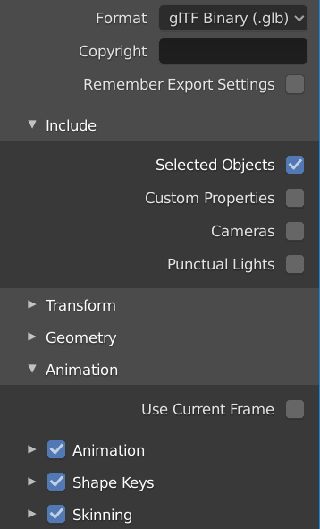 - With the object still selected, click File -> Export -> gLTF 2.0
