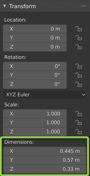 - In the Transform panel, use the Dimensions area to make sure the object is at the right scale.