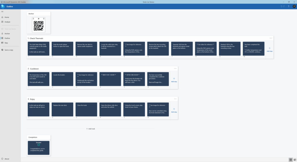 Because Guides is built on top of Dynamics, the setup process is a bit … involved. The downside is a more complex setup than simply installing an app. The upside is a much more robust security and content management model than you’ve probably ever seen on a HoloLens app. I won’t cover installation in this article, but if you want to start a trial or regular account go to Overview of setting up Dynamics 365 Guides.
