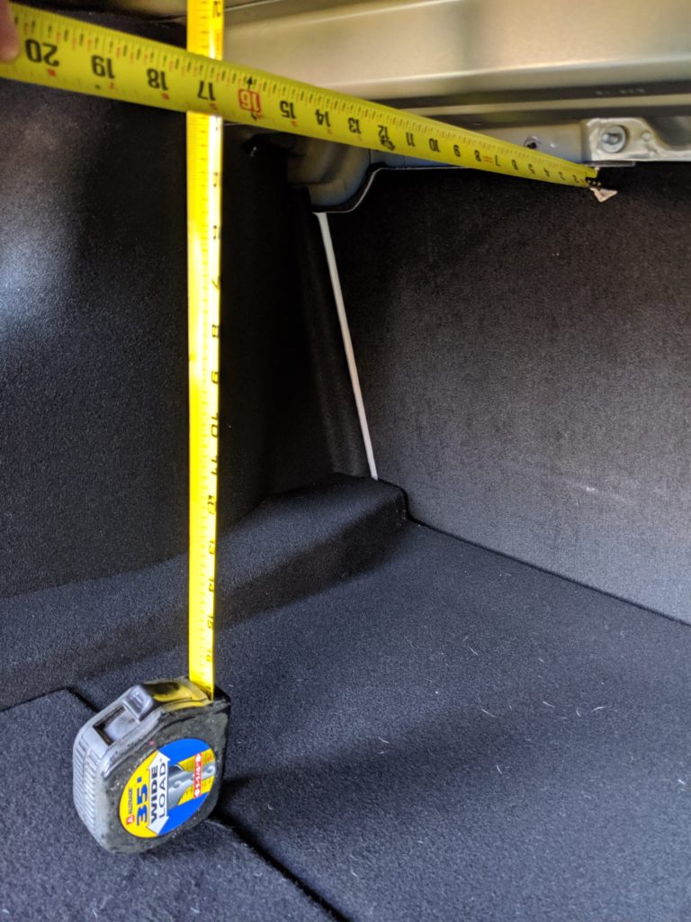 I decided I was willing to give up about 50% of my trunk space, but I still wanted to easily access storage. With that in mind, I set out to take my entirely scientific and highly accurate measurements.