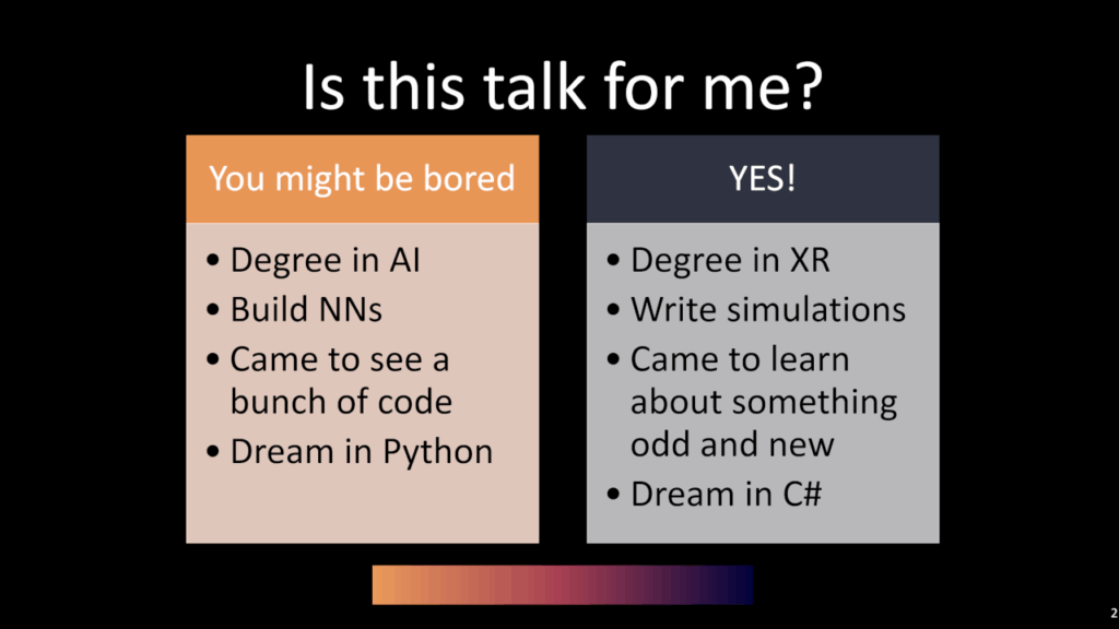 Basically, if you’re already writing DNNs it’s probably not a fit. But if you’re in other areas of CompSci where neural networks seem weird or even magical, it’s probably worth your time. I cover what neural networks are and how they work without writing any code. I use visuals, animations and videos to tell the story, then we finish with seeing how devices like HoloLens use neural networks to understand the world.