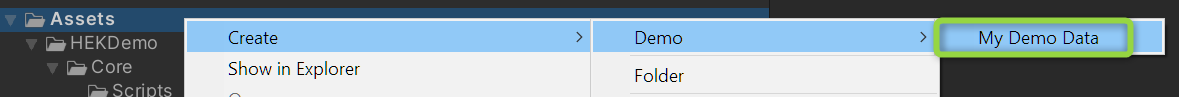 - Don’t forget to add the CreateAssetMenu attribute to your own demo data class. This attribute is what allows your demo data to be created using the Unity context menu.