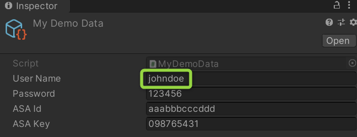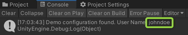 Debug.Log($"Demo configuration found. User Name: {demoData.UserName}");