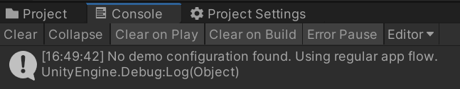 When you first run the app you’ll see this message in the Unity console window: “No demo configuration found. Using regular app flow.”
